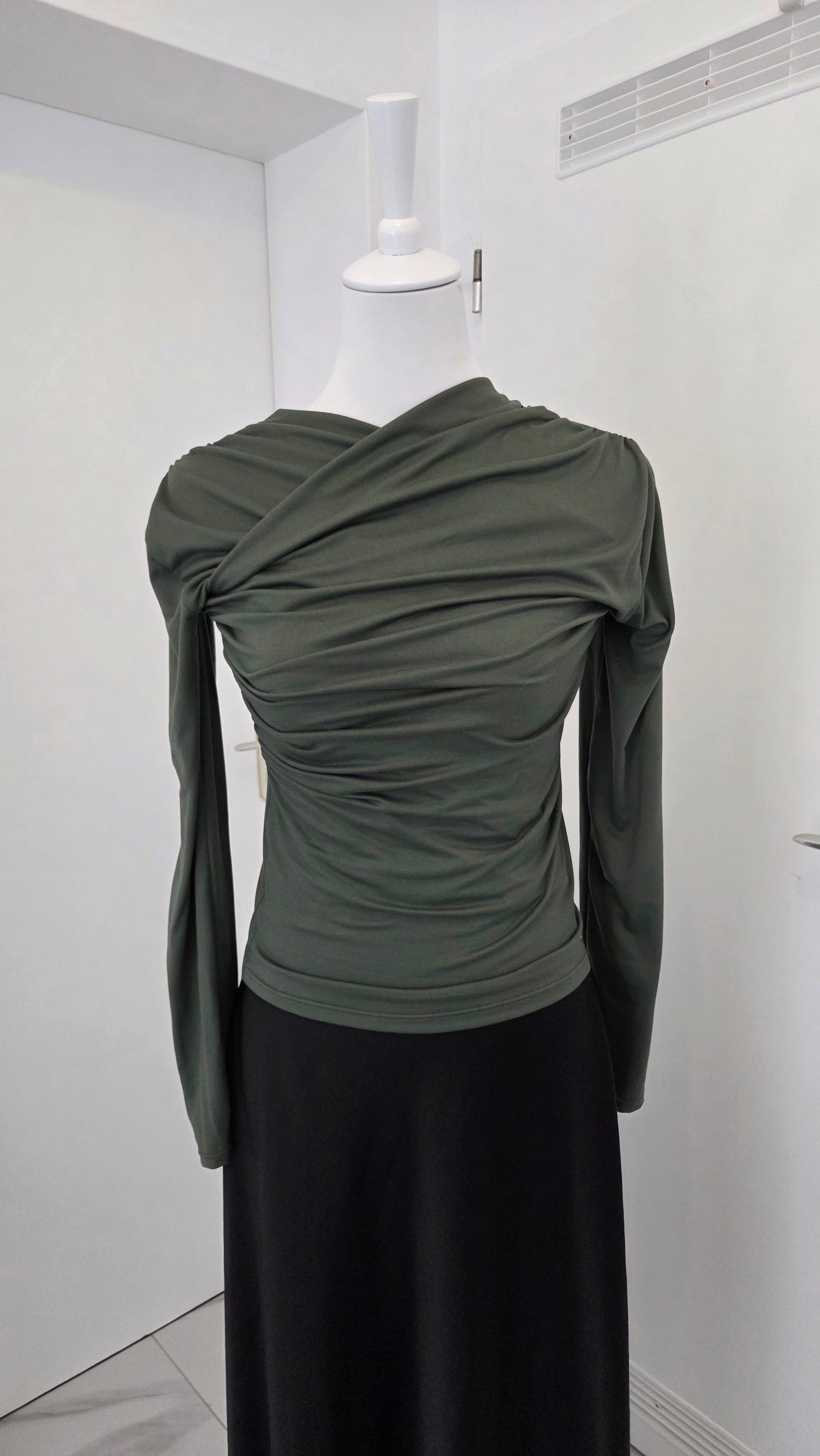 Dieses Oberteil besticht durch seinen einzigartigen Schnitt und die raffinierten Drapierungen im Schulter- & Brustbereich. Das dezente, aber wirkungsvolle Design sorgt für eine feminine Silhouette und verleiht jedem Outfit eine stilvolle Note.
