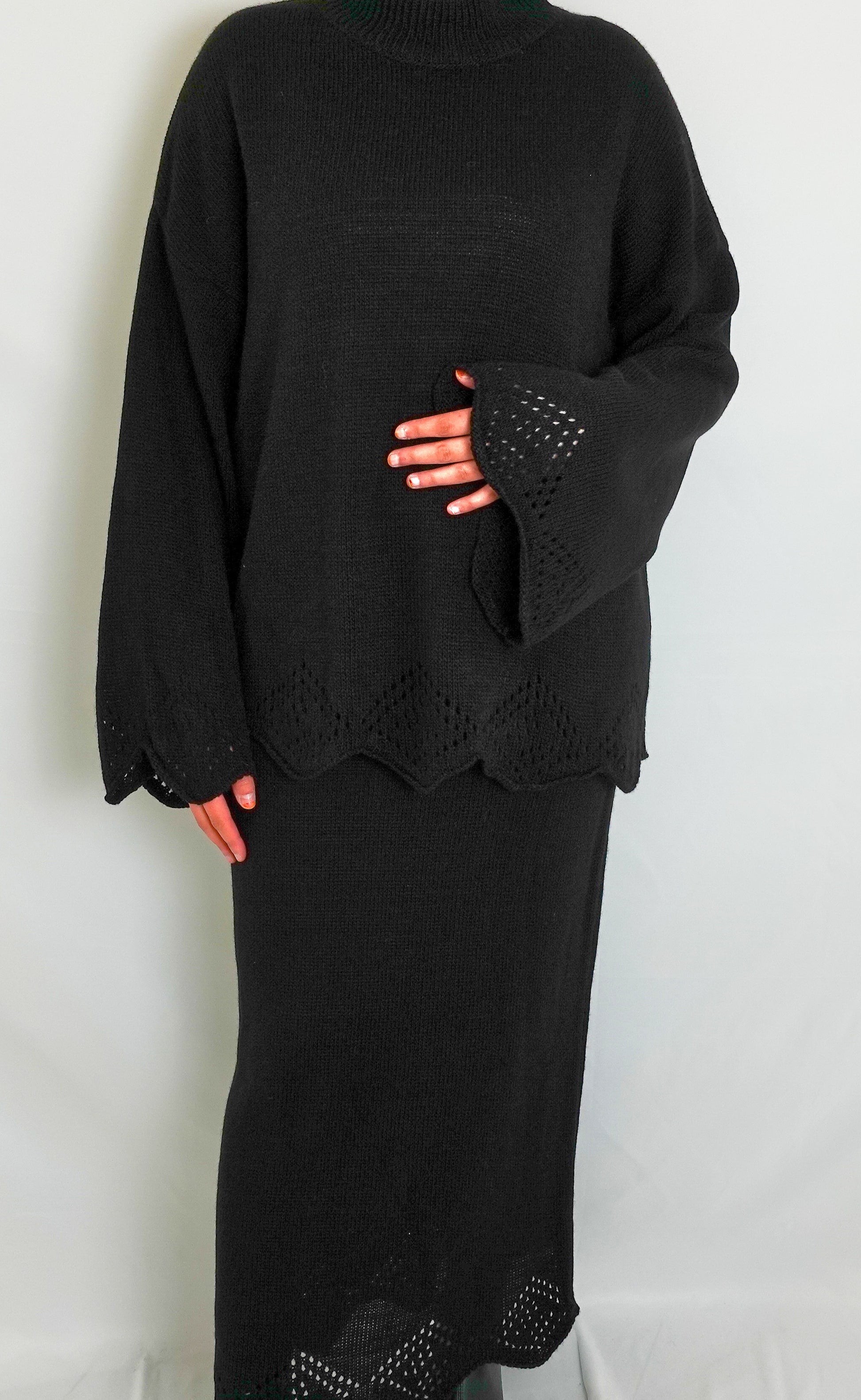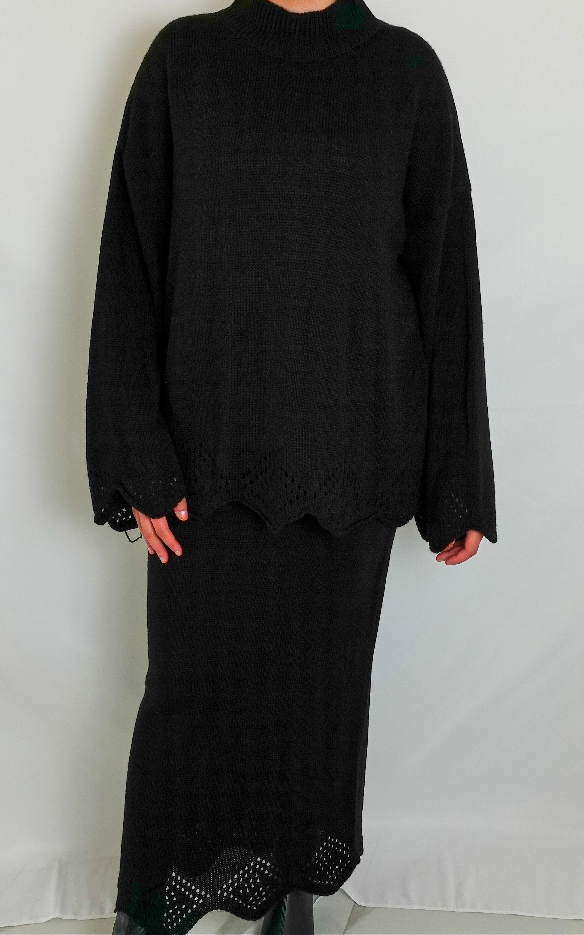 Dieser feminine Zweiteiler vereint Komfort und Stil in einem einzigartigen Design. Das Set besteht aus einem locker geschnittenen Pullover mit weitem Ärmel und einem passenden Strickrock. Raffinierte Spitzendetails an Saum und Ärmeln verleihen dem Look eine elegante Note.
